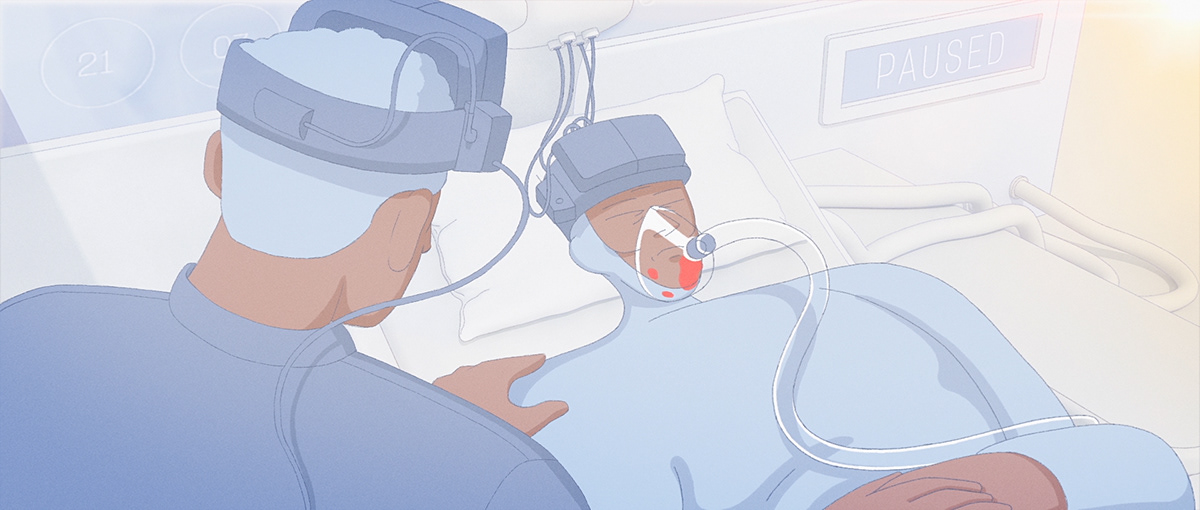 Overlay deals with the revolutionary idea of using VR applications for palliative care treatments. In the story, a brave father, Ray, must face a group of devil guards and weaponed robotic drones in order to bring Ando, his son, back. In the high time of the mission, the plot twist breaks in: Ando appears in a white room next to Ray, who is intubated, lying down on a hospital stretcher. Still waters run deep, just as Overlay’s bigger picture finally conveys its completely human cornerstone.